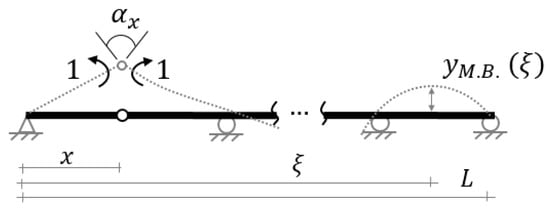 By using Maxwell’s reciprocal theorem and the same procedure, it can be shown that Equation (3) is also valid for the rotation influence line (RIL). In the case of using the RIL instead of the DIL (i.e., instead of ), the moment in Equation (3) equals the internal moment when a unit moment is acting at the point .
