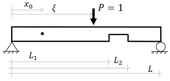 Figure 3 depicts a simply supported beam with a reduction in flexural rigidity from (nominal rigidity) to () between locations and . The deflection influence line of the beam at location is available from recorded deflection data.
