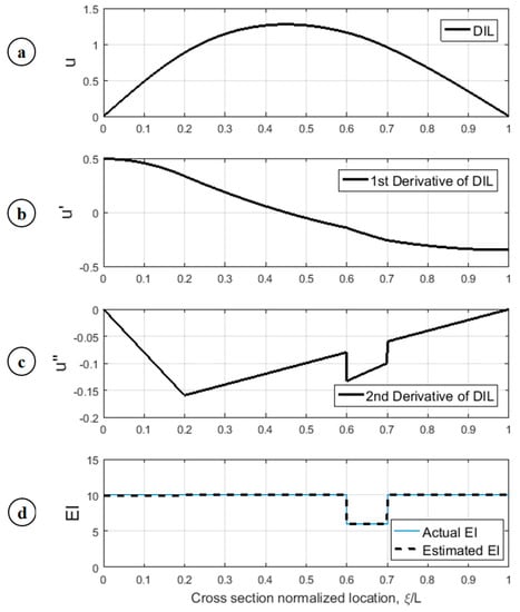 In this section, the DIL is implemented to solve the damage detection problem in Example 2. Like Example 1, the resultant DIL and its first and second derivatives are plotted in Figure 6a–c using a FE model and the CDM. The moment, is a function of the system’s flexural rigidity in indeterminate systems, and its calculation requires additional information. To obtain this additional information, a strain gage is attached to the cross-section at the interior support location. If the status of the flexural rigidity at this cross-section is already known, the measured strains at this cross-section can be converted to internal moment at this location.