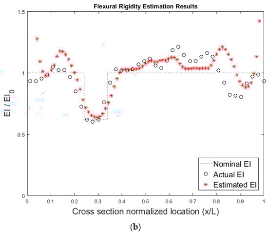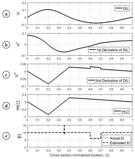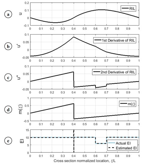 By using Equation (4), the resultant calculated beam flexural rigidity is presented in Figure 6e. As can be seen from Figure 6e, the proposed formula was able to predict the flexural rigidity correctly, aside from a small region between locations and where the flexural rigidity curve diverges.