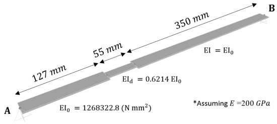 To demonstrate the robustness of the proposed method, the approach is applied on a series of analytical models. Analytical models closely simulate the experimental test that was conducted in Section 6.3. For this purpose, a simply supported beam with a geometrical imperfection near the middle of the span is considered, as shown in Figure 8. Any normalized flexural rigidity value presented in this paper is achieved by using the constant parameter -, representing the intact flexural rigidity defined in Figure 8.