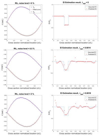 Figure 9 presents the results of the fitted curve of the support RILs at both ends ( of support A is closer to damaged region, in this example). The results of FRE are shown for different noise levels. Even in higher noise levels, the method gives acceptable results regarding flexural rigidity estimation.