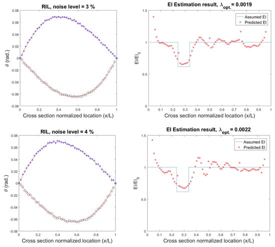 In Equation (27), the parameter is the noise level, is the root-mean-squared of noise-free data, and vector is a normal random vector. Vector has a unit standard deviation, a mean equal to zero, and the same vector length as the vector. In this paper, calculated RILs are polluted with noise levels equal to 0.5%, 1%, 2%, 3%, and 4%. The 4% noise level is significantly higher than the noise level that is observed in the experiment presented in Section 6.3 and illustrates that the FRE is robust to this level.