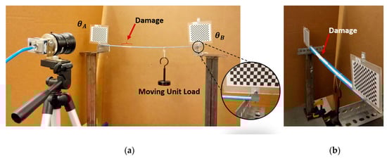 The rotation measurements are conducted by using a machine vision algorithm that is implemented in MATLAB and a robust camera calibration method that tracks the checkerboards that are attached to the ends of this beam. A camera with a resolution of pixels, a 75 mm lens, and checkerboards with mm squares are utilized for this experiment setup. The RILs at the ends of this simply supported beam are calculated by tracking the movements of the checkerboards corners while the load is moved along the beam span. Zeinali et al. [] present the details of this robust measurement method. One advantage of a camera-based displacement estimation is that the location of the load is simultaneously estimated.