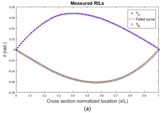 A quadratic piecewise function with 82 pieces and is utilized for the curve fitting. Figure 11a shows the results of RIL measurements and curve fitting to these measurements. By taking the second derivative of the resultant fitted curves and substituting into Equation (28), the flexural rigidity of the specimen is estimated, and results are plotted in Figure 11b and labeled “Estimated EI”.