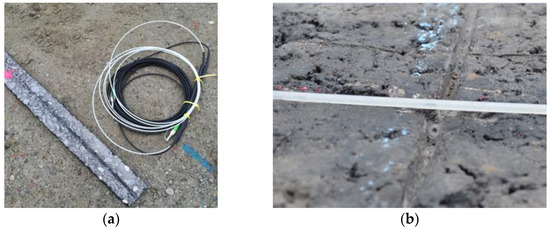 Installation of FBGs in prefabricated asphalt in the base layer (a) and installation of FBGs in the previously constructed asphalt layer (b).