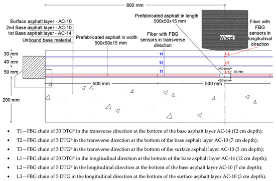 In the present study, FBG chains of 30 DTG® (1529.7–1567.4 nm) and 5 DTG® (1530–1558 nm) were selected for installation in each of three superimposed asphalt layers (the surface layer and both base layers). The FBGs were placed in a cross-section configuration in order to carry out measurements in two directions—transverse and longitudinal directions (in a bicycle path with width of 4 m and length over 3.2 m) (see Figure 2b). The asphalt mix was applied at a temperature between 120 and 160 °C. It was very important to allocate each fiber at the bottom of each layer in transverse (T) and longitudinal (L) directions. Two new approaches to FBG installation in three asphalt layers were tested: (1) installation of FBGs in prefabricated asphalt in the bottom of the base layer (see Figure 2a) and (2) installation of FBGs in the surface of the previously constructed asphalt layer (see Figure 2b). Both innovative approaches allow the implementation of FBGs without sawing the whole layer into two parts. The FBG configuration is shown in Figure 3.