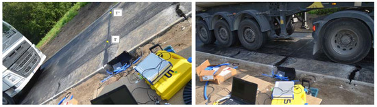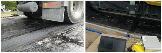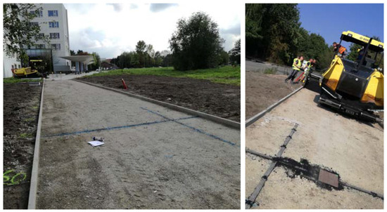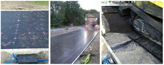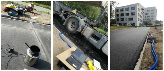 The installation of the FBG monitoring system was a part of a larger project—CyPaTs (www.uantwerpen.be/cypats), in which a bicycle path (length—96 m and width—4 m) was accomplished over 3 days (one asphalt pavement layer per day). During the first day, FBGs (T1 and L1) were installed in the prefabricated asphalt specimens, and the first strain measurements were carried out after the first base layer (AC-14) was laid down. FBGs (T2 and L2) were installed in grooves (in the upper section of this base layer) after 2 h on the same day. In order to ensure the bonding of the interfaces between asphalt layers, a tack coat was applied (see Figure 6). During the second day, FBGs (T1, T2, L1, L2) were monitored during construction of the second base layer (AC-10) while the asphalt truck and the paver were crossing the sensing zone. FBGs (T3 and L3) were installed in grooves after 2 h on the second day. During the third day, all FBGs in T and L directions were monitored during construction works. The strain and temperature data were obtained using an interrogator FBG-SCAN 808D with eight channels (1510–1590 nm wavelength range, 250 Hz measurement speed for all channels).