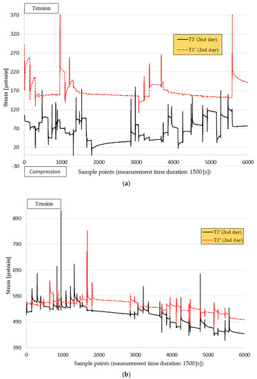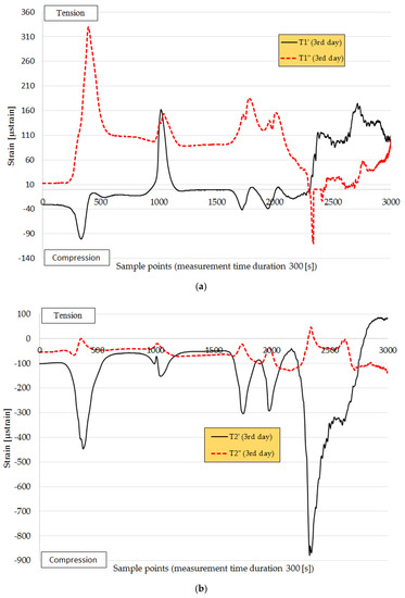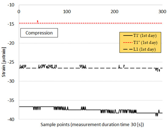 The response of the sensors (strain vs. time) during the construction process can be seen in Figure 7, Figure 8, Figure 9, Figure 10, Figure 11, Figure 12, Figure 13, Figure 14 and Figure 15, where the sensors show a positive shift (tension) or negative shift (compression) during loading. The first registered response of the sensors with no loading 2 h after the installation of the first base layer (AC-14) is shown in Figure 7. With this technology, it was demonstrated that the deformations in the structure can be monitored very accurately; for example, during monitoring, it was observed that axle loading was not equally distributed, and that the response of the sensors under the right wheel (T’—black line) had higher values than those under the left wheel (T’’—red line) of the four-axle truck and paver. Considering this, two sensors from each fiber in the transverse direction were considered for the analysis: one sensor (T’) under one loading point (in the center beneath the wheel) in the three asphalt layers in T direction, and another sensor (T’’) closer to the edge of the road during the 3-day paving process. In Figure 7, it is clear that the responses of T1’ and T1’’ show a difference in strain value, meaning that one side of the road is under higher compression than the other side.
