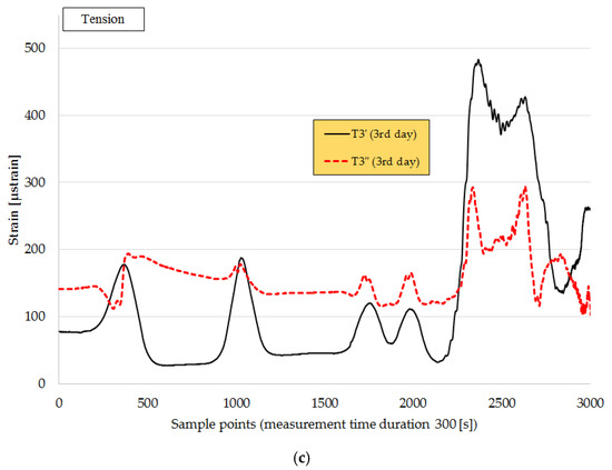 Strain values of sensors: (a) T1’ and T1’’, (b) T2’ and T2’’ at a temperature of 21 °C, and (c) T3’ and T3’’ at a temperature between 24 and 29 °C during the construction of the CyPaTs asphalt pavement on the third day.