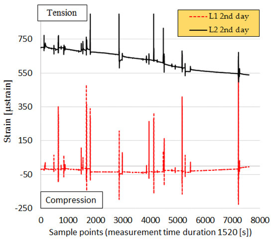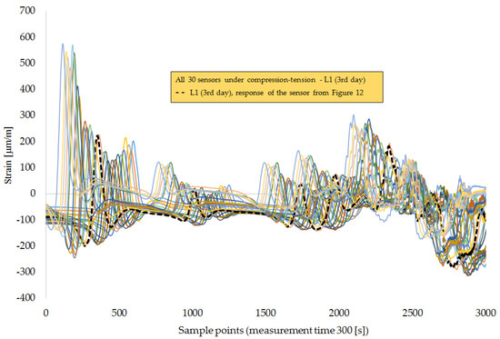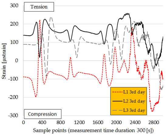 Figure 12 and Figure 13 show the responses of the sensors in the longitudinal direction of the cross-section of FBG chains in transverse and longitudinal directions. In this case, the sensors located closer to the cross-section configurations of FBGs were selected for the analysis. It can be observed that the sensors located at the lower asphalt layer (AC-14) experienced compression, and the sensors in the second base layer detected tension (see Figure 13). In addition, a difference in the response of the sensors in the longitudinal and transverse directions can be observed. The strain peaks are higher in the longitudinal (L) directions than in transverse directions (T). The response of the sensor in the location L1 for all 3 days shows that it was under compression (Figure 7, Figure 12 and Figure 13), but when taking a closer look at the response of the sensor at location T1’, in the transverse direction at the bottom of the first base layer (AC-14), it can be noticed that this sensor is under compression on the first day (see Figure 7), under tension on the second day, and under compression–tension on the third day, when the top layer was laid down.