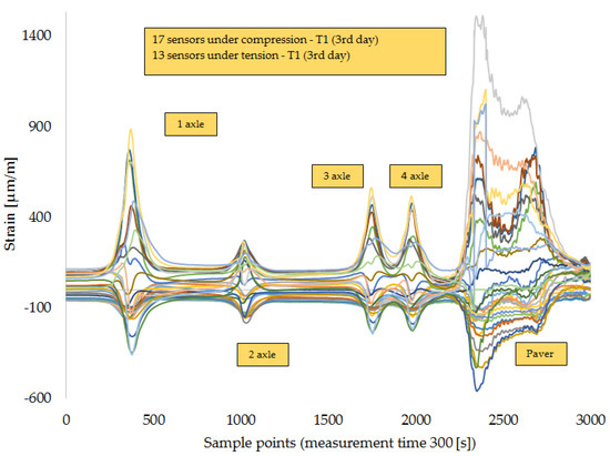 Monitoring of T1 on the third day of the paving process when the four-axle truck and the paver drove along the FBG chain of 30 DTG® (L1) embedded under the first base asphalt layer (AC-14) [17].