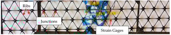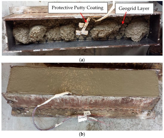 Due to the constrained surface areas of geogrid ribs and the flexible and planar structure of geogrids, it has been shown that installing the delicate strain gages on geogrids can be very challenging [25,26,27]. This study followed three main steps to install strain gages onto the geogrids, namely, surface preparation, gage attachment, and protective coating. Tang, 2011 [28] presents detailed information regarding the steps and procedures for installing strain gages on geogrids. As strain gages are delicate and prone to mechanical and moisture damage, a waterproof putty (PTK-26, Omega Engineering Inc., USA) was used to seal and protect the strain gages (Figure 2a). The putty was flexible enough not to cause unintended reinforcing effects on the geogrids and yet adequately tough to prevent mechanical damages. A thin layer of aluminum sheet was attached to the putty to provide additional protection from pointy aggregates (Figure 2a). Wires that connects strain gages were also protected by the same waterproof putty. All strain gages were still functional prior to the flexural loading tests.