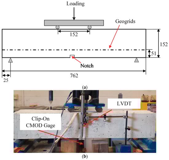 The setup and instrumentation of the four-point loading test is shown in Figure 3. All concrete beams have a support span of 712 mm and a loading span of 152 mm (Figure 3a). A 3 mm wide, 25 mm deep notch was sawed at the midpoint of the bottom face of the concrete beams to promote flexural failure close to the mid-span of the beam.