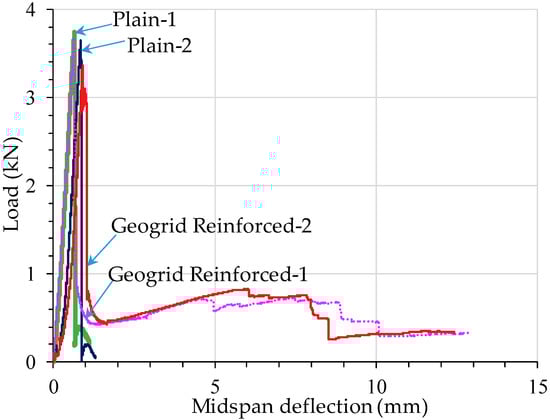 Figure 4 also indicates that geogrid-reinforced specimens exhibit significant deformation before ultimate failure, most likely due to the geogrid’s ductility, while the deformation of the control specimen is minimal, as expected. Table 3 summarizes the results of the flexural four-point testing for the plain and geogrid-reinforced beams.