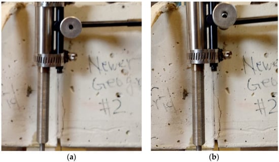 Figure 4 shows the load-midspan displacement responses of the concrete beams to the flexural bending. Two replicate specimens were tested for both the unreinforced and geogrid-reinforced beams. The averaged maximum load is 3.7 kN and 3.5 kN for unreinforced and geogrid-reinforced beams, respectively, indicating that the geogrid in this study does not necessarily contribute to improving the peak flexural strength of plain concrete. However, in looking at Figure 4, it can be seen that the geogrid-reinforced beams carried additional load after the crack was initiated, reaching a maximum post-cracking load of 0.8 kN, or about 23% of the maximum load. It is noted that the maximum post-cracking load is relatively low compared to the maximum peak load. Unlike other unconventional discrete types of reinforcements such as fibers whose bonding with concrete is the primary contributor to the reinforcement, geogrids are continuous and planar-type reinforcements, and carry the majority of the post-crack load upon the initiation of cracks in concrete. Thus, for geogrid-reinforced concrete, its post-crack load-carrying capacity relies on the ultimate tensile strength of the geogrids embedded in the concrete. The polypropylene (PP) type of geogrid used in this study typically has a relatively low ultimate tensile strength compared to other types of geogrids materials such as polyester (PET) or high-density polyethylene (HDPE) [29]. It is expected that the post-crack load would increase substantially when multiple layers of geogrids are installed in the concrete.