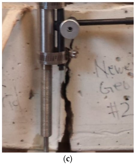 Two linear variable differential transformers (LVDTs) were installed at the midspan of the beam, with one on each side to measure midspan deflection during loading (Figure 3b). A clip-on gage (EDS-0500-500T-S, Reliant Technology LLC, Colorado Springs, CO, USA) was installed at the notch at bottom of midspan to measure the crack mouth opening displacement (CMOD) during loading (Figure 3b).