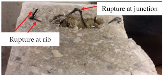 After the initial cracking, load is redistributed to the geogrids embedded at the lower portion of the beam. Based on pullout tests for geogrids embedded in concrete cement, a past study found that geogrids with roughened surfaces were able to provide surface frictional resistance force to cause a fracture failure of the geogrid instead of a pullout failure [33]. For the concrete specimens consisting of coarse aggregates in this study, in addition to frictional resistance along the geogrid’s surface, the developed passive stress against the geogrid’s bearing rib can provide pullout resistance. Geogrids were fractured at both the junctions and ribs, as depicted in Figure 6. No signs of slippage or pullout of geogrids were found upon a close examination of the geogrid surfaces post failure. This is further confirmed by the strain measurements in geogrids that are presented later.