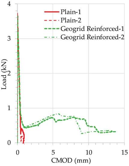 A clip-on gage was used to measure the crack mouth opening displacement (CMOD) at the notch of the beams. Figure 7 shows the CMOD measurements until collapse failure of the beams. The sudden drop of load, along with a significant increase of CMOD, indicates the initiation of cracking. As can be seen in Figure 7, extensive CMOD occurs for geogrid-reinforced concrete beams after the initial cracking, whereas the plain concrete beams exhibited very little CMOD, indicating an abrupt, brittle failure. This resembles the observations from images of beams during loading and at failure (Figure 5). As the load is redistributed to the geogrids after the initial cracking in concrete, the load increases gradually as geogrids elongate until a rupture of ribs or junctions occurs.