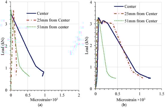 Additionally, as shown in Figure 8, all of the geogrids were activated and mobilized instantly upon the application of the flexural load. With the exception of the location that is 25 mm from the center in specimen 1, for each respective concrete beam, the strain measurements at all locations are approximately the same until the peak load or the initial cracking. This suggests that the geogrids in each of the concrete beams were uniformly mobilized, and that the geogrids embedded in concrete acted as a whole without slippage or pullout from the concrete. After the peak load or the initial cracking, most of the tensile force is transferred to the geogrids, and strains were not uniformly developed or distributed, as seen in Figure 8. As expected, more strains developed in geogrids at locations closer to the center after the initial cracking.