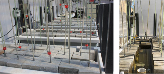 To accelerate the deterioration of the bond between the GFRP rebars and the concrete, the specimens were exposed to seawater at different temperatures. Of the 63 specimens, 54 were submerged in seawater tanks (see Figure 2), while the remaining nine were tested in their virgin state without conditioning, to obtain control values for the analysis of the potential deterioration (see Table 2).