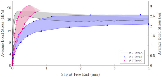 The bond stress development was also affected based on the selected rebar type: sand coated rebars (type A) activate the full bond strength rapidly and exhibit the stiffest bond with concrete (free-end slippage). Type A rebars were followed by ribbed (type C) rebars, while the highest slippage may be expected for GFRP rebars with external cross fibers (type B); these rebars may slip about 20 times more than rebars with other surface enhancements. After the maximum bond was reached, type A and B rebars gradually debonded, while ribbed bars (type C) promoted a sudden-slip failure.