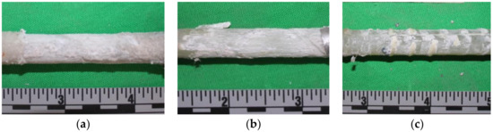 Bond surface of the GFRP rebar after completion of the bond test: type A (a), type B (b) and type (c).