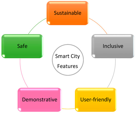 Smart city aims to make cities safe, sustainable, inclusive, user-friendly and demonstrative, as described in Figure 1 [3]. The safety of citizens includes their privacy protection on online platforms, safety from accidents and prevention of crimes. The criterion of sustainability encompasses the fields of environment, economy, governance and society. The inclusiveness vision targets the removal of any bias in access to digital services due to diversity in income, race, age and gender. The services provided by the smart cities should be easily accessible and easy to use. Digitals platforms created should empower residents by expanding civic engagement in collection of data and decision-making. Lastly, the city can provide a platform to innovators and start-ups which will create new impactful and transformative technologies that will have an everlasting effect on the way people live.