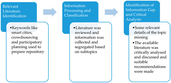 Firstly, suitable literature was identified to gain insight into the modern vision of smart cities and demand for intelligent infrastructure systems to make cities smart. A detailed study was conducted to understand the link between smart cities, crowdsourcing and participatory planning. A study of the existing smart city solutions was done and segregated according the field of infrastructure they cater to, some of which have been discussed in the previous section. This was done to evaluate the processes that are employed in any crowdsourcing platform and later, identify the challenges in each of them. Since the focus of the paper is only on the challenges and opportunities of crowdsourcing, the literature was now focused only on these two. Therefore, literature on challenges faced by existing crowdsourcing platforms was reviewed and specific attributes were identified. There were more than one hundred scholarly articles, government brochures, smart city proposals and company journals identified for a primary review. These articles and reports were published predominantly between 2003 and 2016. All these articles were organized in the form of a repository and then segregated according to the specific concepts each of them covered. Since the information in many research articles was overlapping and sometimes, one article addressed more than one attribute, 36 articles were shortlisted for addressing specific attributes in entirety.