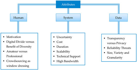 To fully understand the intricacies involved in any participatory planning and development initiative, it is important to gain perspective into these cyber-physical systems with human-in-the-loop. Brandsen and Holzer [42] mention economics, service management and consumer psychology as the theoretical strands contributing to user and community co-production. The following discussion classifies all attributes of a crowdsourcing procedure falling into the above categories into (1) Human, (2) Data and (3) System characteristics. These characteristics have also been enlisted in Figure 8. Human characteristics refer to the feelings and behavioral patterns of people involved in the process. Data characteristics involve privacy and reliability issues of data. System characteristics hint at the technical details of the project provided by the client and how it can impact the efficient functioning of the system as a whole. The interconnection of these attributes of crowdsourcing makes prediction of its success a very complex task.