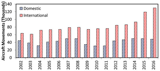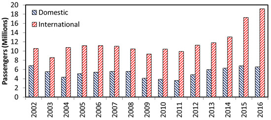 Figure 1 shows the total annual domestic and international passengers at KIX since its inception of operations from 2002 to 2015. The aftermath of the impact of 9/11 and the 2008 global financial crisis (GFC) can clearly be observed in the annual domestic and international enplaned passengers. Figure 1 also shows that the international passenger numbers are more significant relative to the domestic passenger numbers. This is due to Osaka International Airport primarily acting as the major local domestic terminal for the city of Osaka. In addition, since 2012, the low-cost carriers (LCCs) have emerged in the Japanese market and these carriers appear to be particularly important for KIX. Peach Aviation (a joint venture including ANA) is now one the airport’s leading airlines in terms of weekly departures. In the July 2012, Jetstar Japan, also an LCC, commenced business at KIX and has subsequently grown their operations at the airport. The LCCs have helped to drive traffic growth at the airport [60].