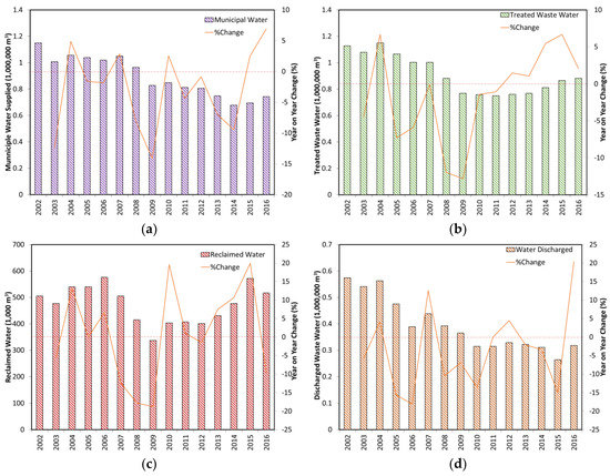 The total annual water quantities at KIX during 2002–2016 and the year-on-year change (%): (a) municipally supplied, (b) treated, (c) reclaimed, and (d) discharged. Source: data derived from References [10,11,12,13]. Note: Year-on-year change axis varies in span, and a reference “0” line is included to facilitate comparison.