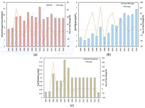The annual wastewater pollutants at KIX during 2002–2016 and the year-on-year change (%): (a) Chemical Oxygen Demand (COD), (b) nitrogen, and (c) phosphates. Source: data derived from [12,13].