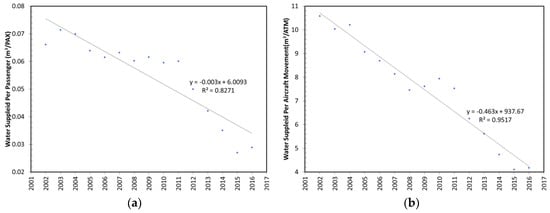 The scatter plot showing the line of best fit and correlation coefficient (squared) of KIX 2002–2016 annual municipally supplied water consumption: (a) per passenger and (b) per aircraft movement. Source: Data derived from References [10,11,12,13].