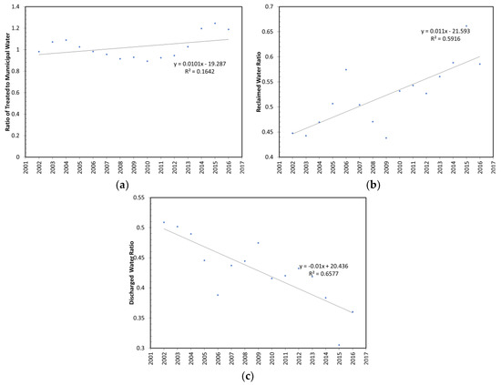 The scatter plot showing the line of best fit and correlation coefficient (squared) of KIX 2002–2016 annual water ratios: (a) treated to supply, (b) reclaimed to treated, and (c) discharged to treated. Source: Data derived from References [12,13].