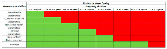 The central component of most IAM frameworks and tools is the risk matrix that provides a “dashboard” for IAM decision-making. Risk matrices are widely promoted in risk management standards and reference books and are used in a number of different disciplines like disaster risk management, production management, defence applications, logistics, etc. [34]. A risk matrix formulated to assess water-quality-related risk [35] is shown in Figure 1. The green-coloured cell indicates low-risk and no further action is required, whereas the red cells indicate high-risk and actions have to be taken to reduce those. Risk matrices are both lauded and criticized for their appropriateness in decision-making [36,37]. According to Talbot [37], some of the advantages in using risk matrices are (i) robustness in decision-making; (ii) consistency in prioritizing risks; (iii) keeping the focus on high-priority risks; and (iv) presenting complex risk data in a concise visual fashion. However, risk matrices are blamed for poor resolution, errors in mistakenly assigning high qualitative ratings to smaller risks, suboptimal resource allocation, and ambiguity [36].