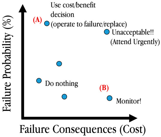 Understanding that risk can be defined as the product of probability and consequence of failure, this figure shows risk as increasing diagonally with increasing consequence and probability. A given high-probability low-consequence event (B in Figure 2) and a low-probability high-consequence event (A in Figure 2) can result in the same risk score (depicted by colours in Figure 1, but can be represented as a number too). However, in the IAM context, while it is true that the risk scores of A and B are the same, the actions that have to be taken to address them are completely different. This is illustrated in Figure 2. While the appropriate action to manage the risk of type B is close monitoring, that for A is to follow a cost/benefit-based decision-making process, whose results may lead to a decision whether to operate to failure or renew/replace.