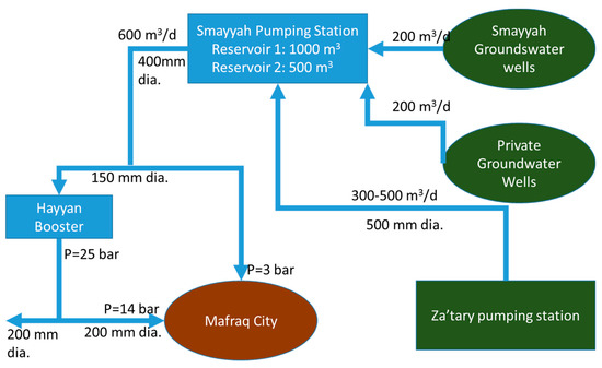 Al-Mafraq entirely depends upon groundwater for its domestic and industrial water needs. Water is sourced from tube wells owned by Yarmouk water utility near Smayyah pumping station, Za’tary pumping station, and from private wells. Water from all these wells is collected at Smayyah pumping station and conveyed to Al-Mafraq through a 400-mm diameter transmission line. Al-Mafraq does not have an elevated service reservoir, and the distribution network is directly coupled with this transmission main. Hayyan booster pumping station within Al-Mafraq pumps water to the elevated areas. Al-Mafraq is divided into water rationing zones, a practice prevalent in Jordan as water is scarce. Each zone is supplied with a limited amount of water during a designated period of the week and is managed based on the knowledge of the operators. Due to the absence of detailed data and for the sake of simplicity, these rationing zones (which are practically district metering zones as they can be independently closed/opened) represented the distribution network within the city for our risk analysis instead of, for example, individual pipes. The schematic drawing (Figure 3) and understanding the daily water rationing practice helped in identifying and discussing the operational problems, as well as the critical assets. Field visits and consultations with the field staff enabled a comprehensive understanding of the water supply system and its operation. Also, it created an awareness of the importance of having an asset register with basic data including age, condition, and failure rates.