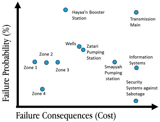 The preparation of the schematic diagram, and the joint field visits and discussion about the assets led to the consolidation of information needed to answer the following: asset management questions such as (a) Which assets do we have and how are these assets performing?; (b) Which assets fail often, and why?; (c) Which assets are the most important?; This information was used to perform the risk analysis based on the probability of failure and consequence of failure resulting in the risk matrix for the Al-Mafraq water supply system (Figure 4). From Figure 4, it can be seen that the probability of failure and consequence of the failure of assets in Al-Mafraq’s water supply system varies. The most critical assets—transmission main and Hayan booster—can be found at the top right corner of the matrix, which has the highest consequence of failure and the highest probability of failure.