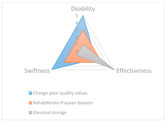 In most cases, it is imperative to prioritize the actions, as the focus is to effectively utilize the limited resources and to be efficient. In order to simplify the selection process, the prioritized actions (Table 1) could be evaluated against three criteria: “doability” (effort needed to implement), swiftness (time taken to implement), and effectiveness (how effective it achieves the system objectives). A diagram similar to Figure 6 can help illustrate this in a manner conducive for prioritization.
