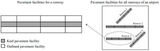 Maintaining airfield pavement conditions at satisfactory levels to ensure safe and efficient aircraft operations involves substantial funding for maintenance and rehabilitation (M&R). In the US national airport system, the amount of federal funding for runway rehabilitation alone accumulated to more than $5.1 billion between 2008 and 2017 []. How to spend the funding at major airports is generally directed by airport pavement management systems (APMSs), which rely on the PAVER software [,] to schedule M&R policies on pavement facilities (note: following the pavement management literature, the terms “M&R activities” and “M&R policies” are used interchangeably in the paper). In the airport pavement management literature, a pavement facility refers to the smallest pavement unit for condition assessment and M&R planning. Typically, a runway consists of multiple pavement facilities. As an illustration, in Figure 1 an airport has four runways. The pavement of Runway 3 is divided longitudinally and laterally into 12 facilities. The four facilities on the upper side and the four facilities on the lower side (in white) are termed outband pavement facilities. The four facilities in the middle (in grey) are termed keel pavement facilities. The lateral division is made to account for the channelization of aircraft traffic load across a runway [].