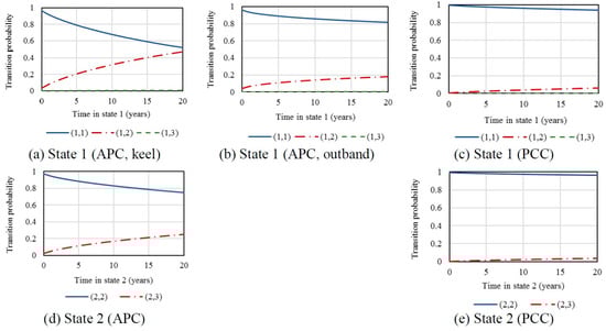 Transition probabilities for pavement facilities in: (a)–(c) state 1; and (d,e) state 2.
