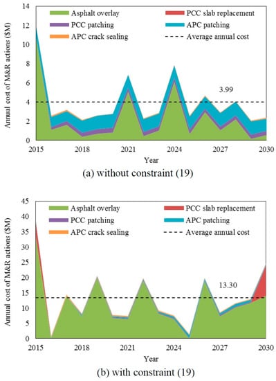 Figure 3b depicts the distribution of annual M&R costs over the planning horizon when constraint (19) is considered to ensure that a major M&R action (asphalt overlay or slab replacement) is implemented on a whole runway—rather than on only part of it, should the major action be selected. Like Figure 3a, the costs come from the simulation run of which the sum of the simulated costs in each of the future years plus the cost of the first year is the closest to the average over all simulation runs. With this added constraint, the total M&R cost has increased significantly, to $212.8 million (note that the y-axis ranges are different in Figure 3a,b). This is not surprising, as adding constraint (19) eliminates the flexibility to perform major rehabilitation on only part of a runway. Among the simulated total cost, asphalt overlay accounts for the majority—86%. The cost shares of PCC slab replacement, PCC patching, APC patching, and APC crack sealing in the total are small, at 6.8%, 1.7%, 3.5%, and 2.0% respectively.