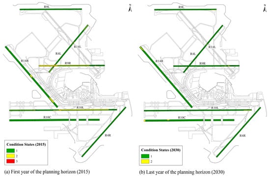Condition states of runway pavements at Chicago O’Hare airport. (a) First year of the planning horizon (2015). (b) Last year of the planning horizon (2030).