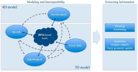 The main objective of the proposed study is to analyze the current capacity of BIM tools, when used in the field of railway infrastructure. With this purpose, a case study concerning the rehabilitation of a railway segment was considered, having applied various software, in order to assess the benefits and limitations inherent in the process. The paper describes the three-Dimensional (3D) modeling of the project in two BIM software programs and, additionally, the four-Dimensional (4D) modeling using another BIM viewer. Tests for interoperability were carried out before the use of the various BIM-based tools. The capacity for extracting information that could be used for infrastructure design, construction, and maintenance was also explored. The findings showed that there is still a huge technological inability in this field.