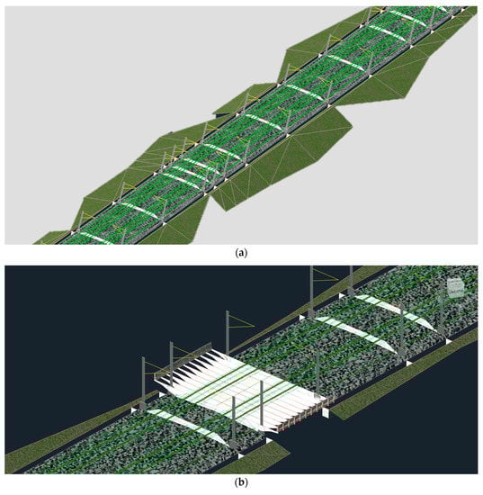 The 3D modeling of the railway infrastructure by Civil 3D® included the track substructure (subgrade and sub-ballast layers) and the superstructure (ballast layer), including also some components of the drainage (pipes) and catenary (vertical poles and cantilevers) systems. After the definition of the horizontal alignment, the longitudinal profile of the terrain was created, and finally, the vertical alignment was established in line with an adequate balance of earthworks and respecting geometric requirements. The two main cross-sections of the rail track were then designed: a section relating to the general railway line and another section corresponding to the particular case of a box culvert. Figure 4a shows a generic part of the 3D model. In Figure 4b is represented a box culvert integrated in the embankment.