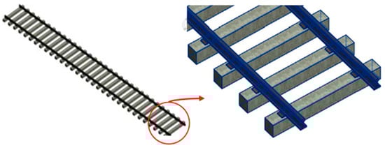 Based on the integration of two families already existing in the BIM Library related to rail track components—rail, sleeper, and fastening—and using the Railing command, on the Architecture tab and in the Circulation panel, a new Revit® family was created in order to represent the complete rail track: two rails, equidistant sleepers, and corresponding fastenings. In order to ensure the most accurate placement of the rails in the fastenings, some parameters were changed, e.g., Base offset, Top offset, and Distance from previous. The Iberian track gauge of 1668 mm was adopted for this family. Figure 5 represents the 3D model of the rail track family created in Revit®.