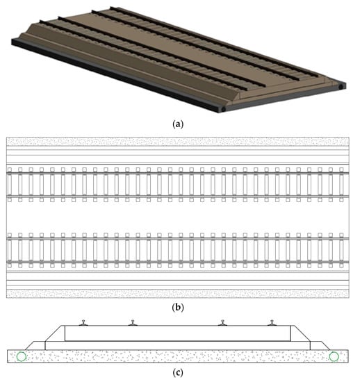 Figure 6 represents the 3D model of the complete rail track including drainage: a perspective representation of the global 3D model (Figure 6a); a plan representation of the model (Figure 6b); and a representation of the cross-section of the total rail track structure and lateral drainage pipes (Figure 6c).
