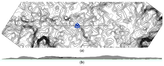 The interoperability between Civil 3D® and Revit® was also analyzed in terms of the terrain modeling. To import the terrain model, the Import CAD command was selected in the Import panel of the Insert tab. Then, the terrain surface was optimized using the Toposurface command in the Model Site panel, Massing & Site tab. In a new tab, the Create command from Import was selected. Figure 7 shows the final terrain model that was obtained: plan view (Figure 7a) and longitudinal profile (Figure 7b).