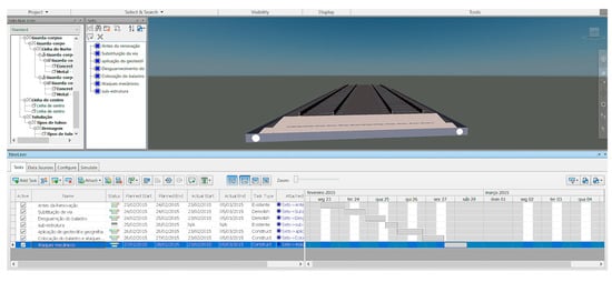 A Gantt chart, concerning the rehabilitation of the rail track segment, was established directly within the Navisworks®. Using the capacity of this BIM viewer, each task was linked to the correspondent construction component (ballast, substructure, geotextile, and geogrid). To accomplish this operation, the BIM model was created in a way that allowed the representation of each construction step. As such, it was possible to establish adequate links between geometric construction phases, representing the physical construction progress of the rail track rehabilitation, as illustrated in Figure 8.